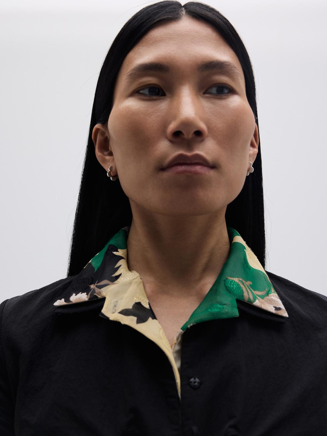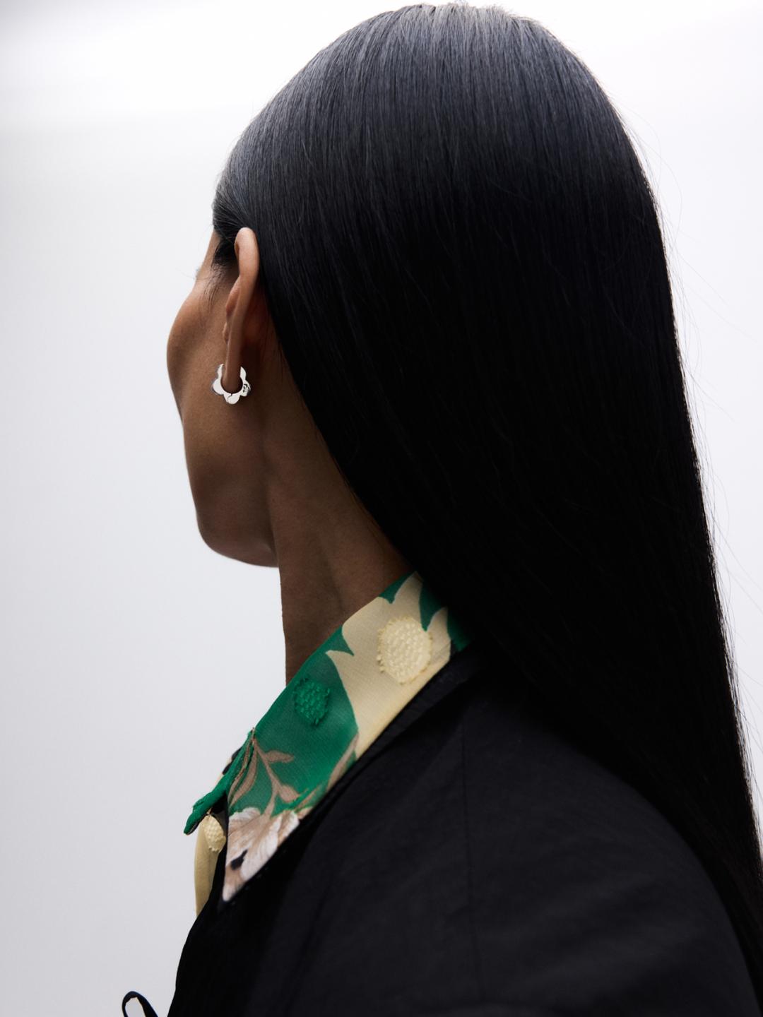 Парные серьги-хупы небольшого размера с резным краем. Пространство вокруг мочки заполнено, поэтому серьги будто обнимают её. Вокруг логотипа мы добавили эффект оплывшего металла, а сама форма пятилистников отсылает к фирменным лепесткам J.Kim.
