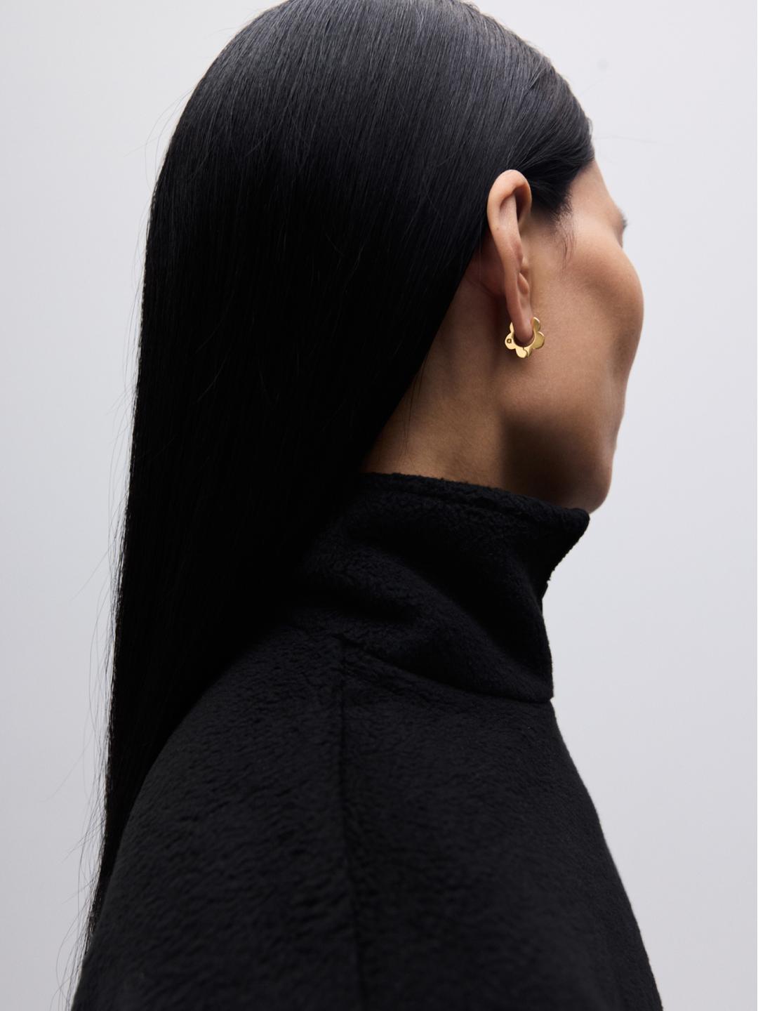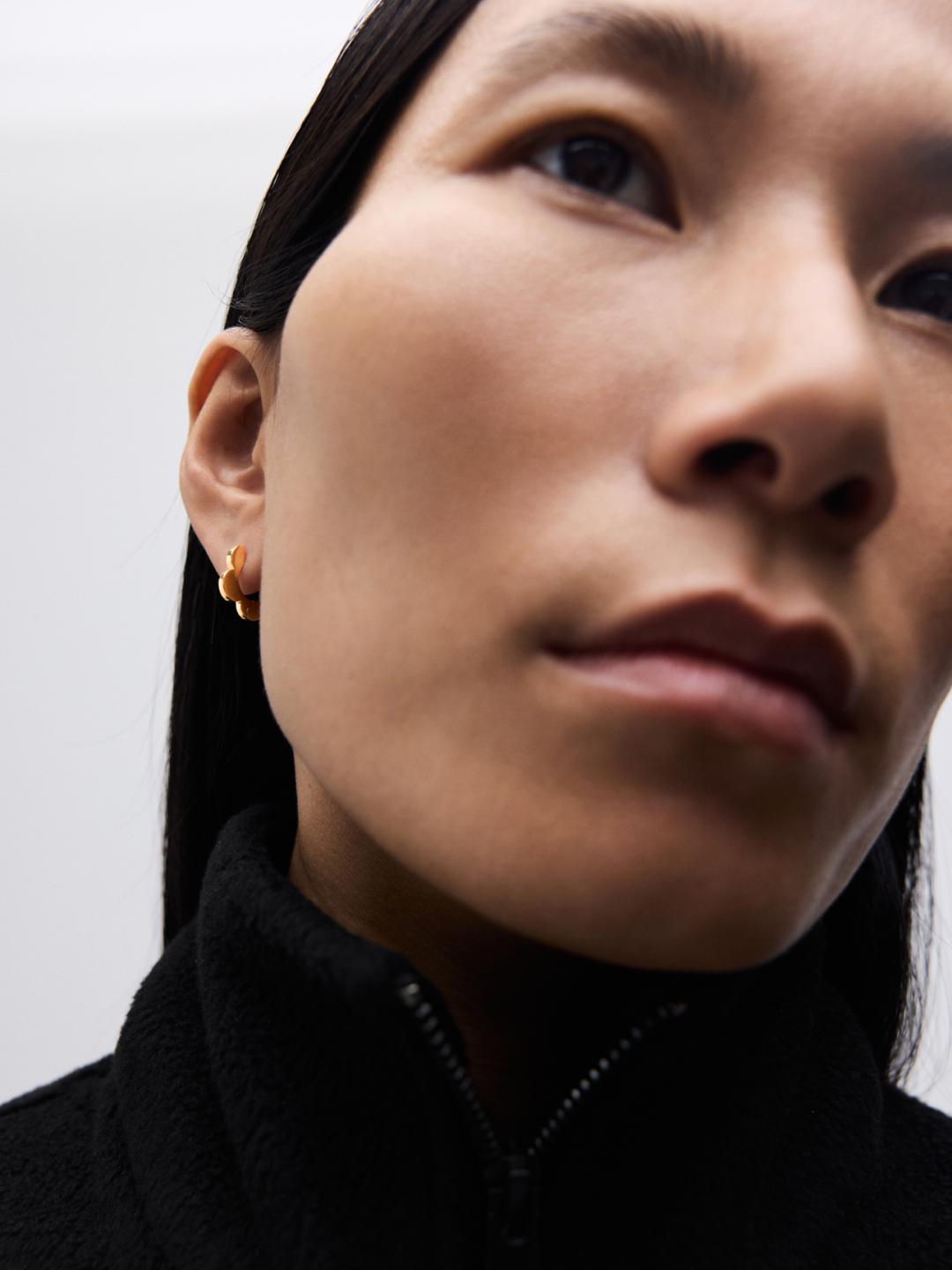 Парные серьги-хупы небольшого размера с резным краем. Пространство вокруг мочки заполнено, поэтому серьги будто обнимают её. Вокруг логотипа мы добавили эффект оплывшего металла, а сама форма пятилистников отсылает к фирменным лепесткам J.Kim.