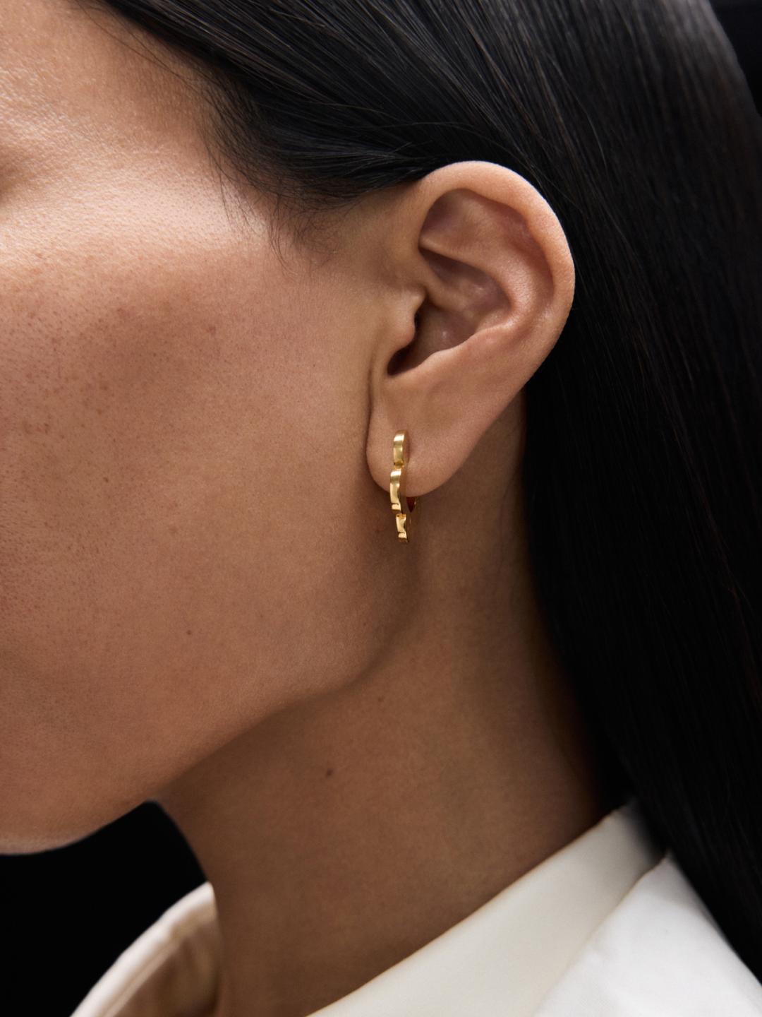 Это парные серьги-хупы среднего размера с резным краем. Пространство вокруг мочки заполнено, поэтому серьги будто обнимают её.