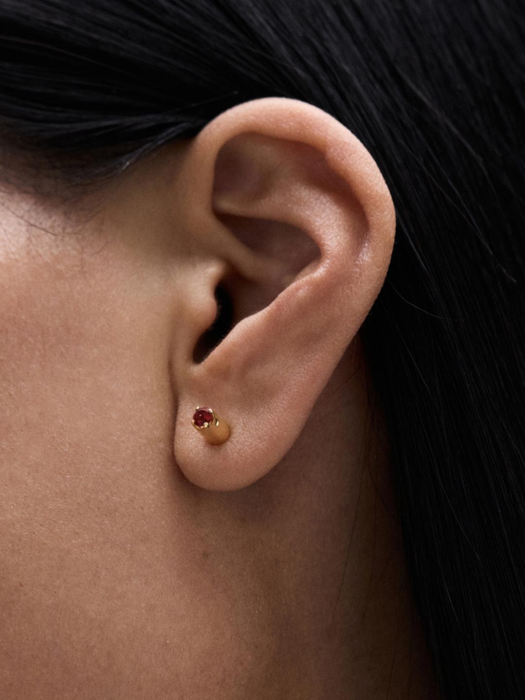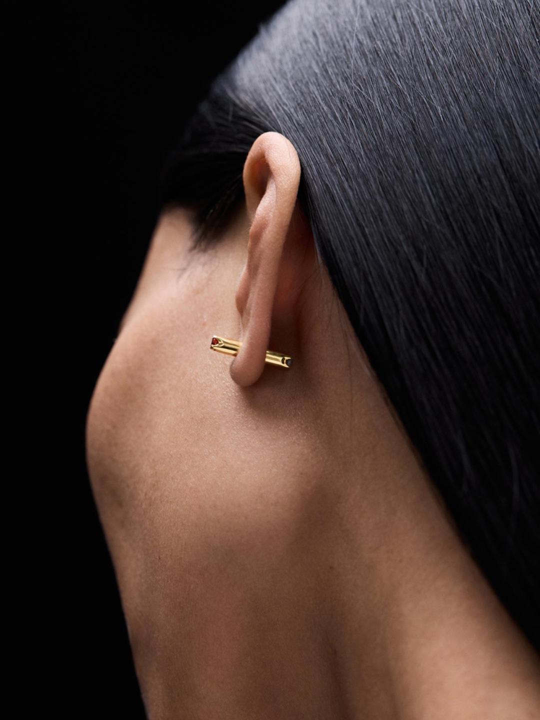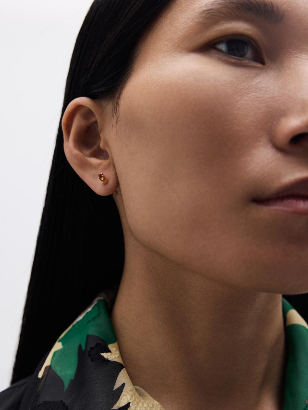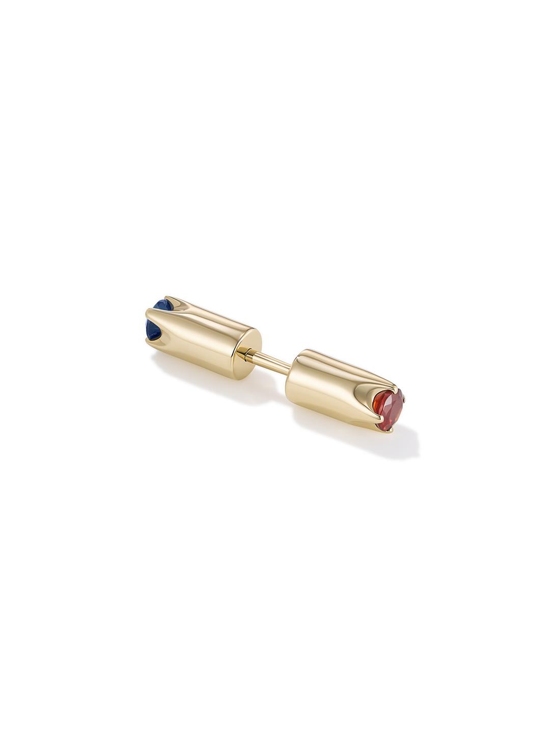 Эти серьги пополнили семейство пуссет-перевертышей в Августе. Синий сапфир и темно-красный гранат закреплены на разных сторонах, так чтобы украшение можно было переворачивать, а форма крошечных лапок-крапанов отсылает к фирменным лепесткам J.Kim.