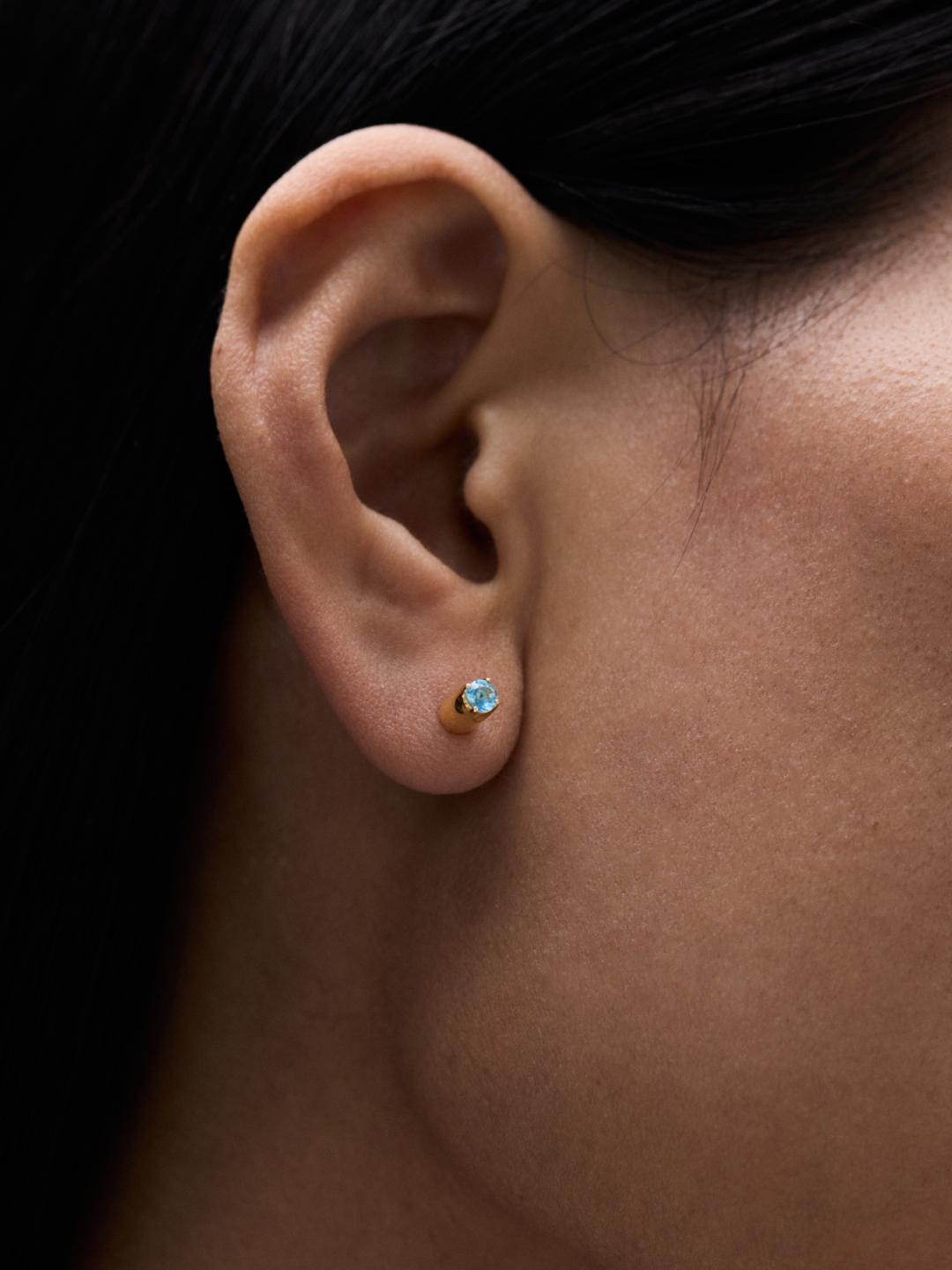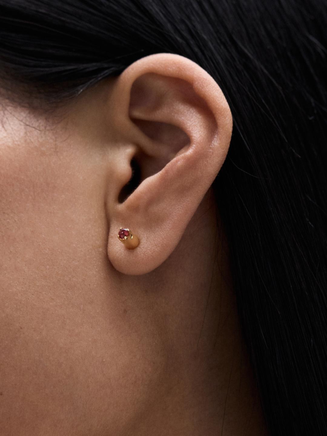 Эти серьги пополнили семейство пуссет-перевёртышей в Августе. Голубой топаз и тёмно-красный гранат закреплены на разных сторонах, так чтобы украшение можно было переворачивать. Форма крошечных лапок-крапанов отсылает к фирменным лепесткам J.Kim.