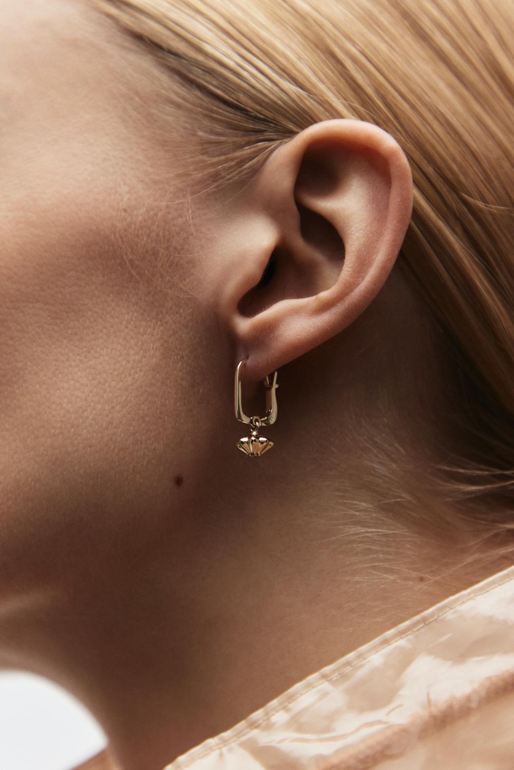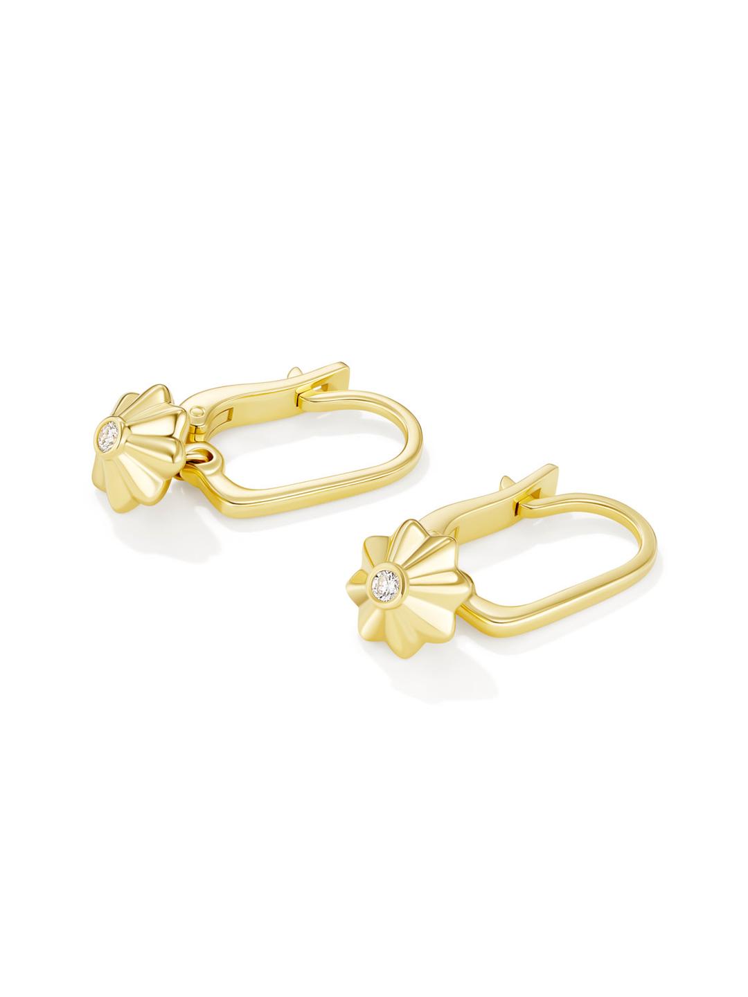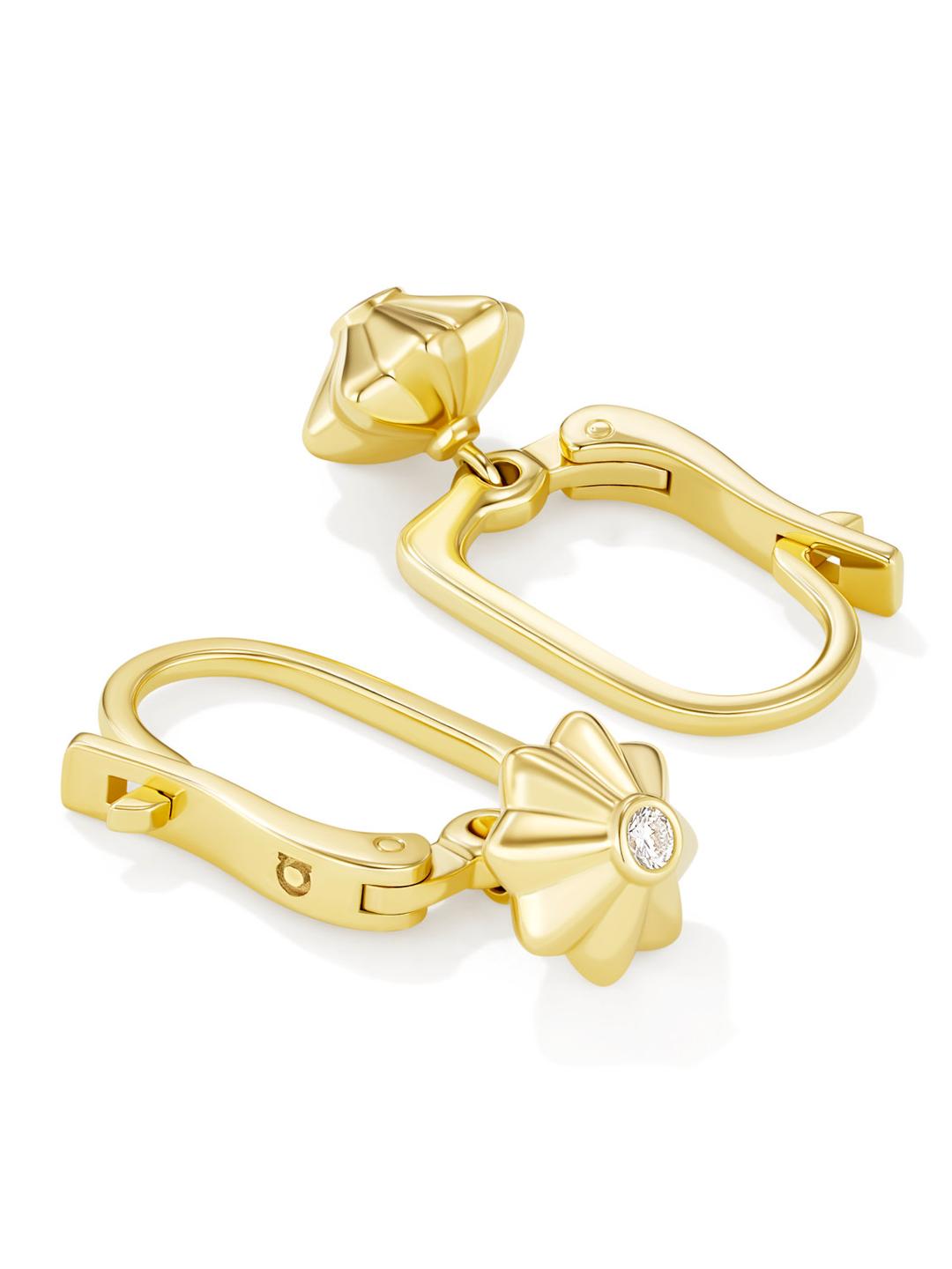 Пара покачивающихся золотых фонариков на английском замке. Форма замка — как ручка фонарика. Внизу у каждой серьги спрятан круглый бриллиант — наше жгучее намерение, которое поднимает бумажный фонарик в воздух.