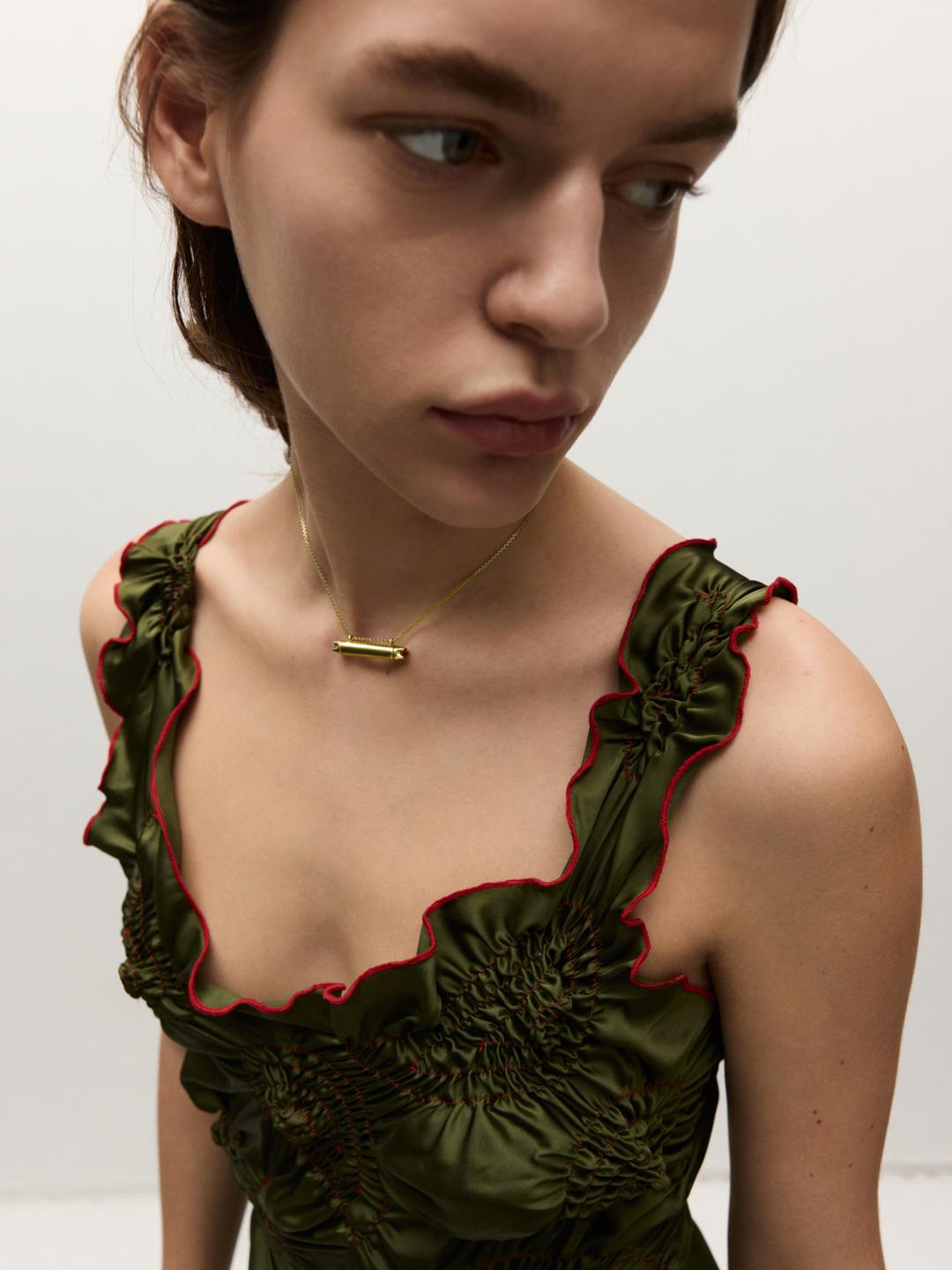 Украшение из коллаборации Avgvst x J.Kim. Эта подвеска сделана по мотивам цилиндрического амулета-тумара. Внутрь тумара закладывали записку с молитвой.