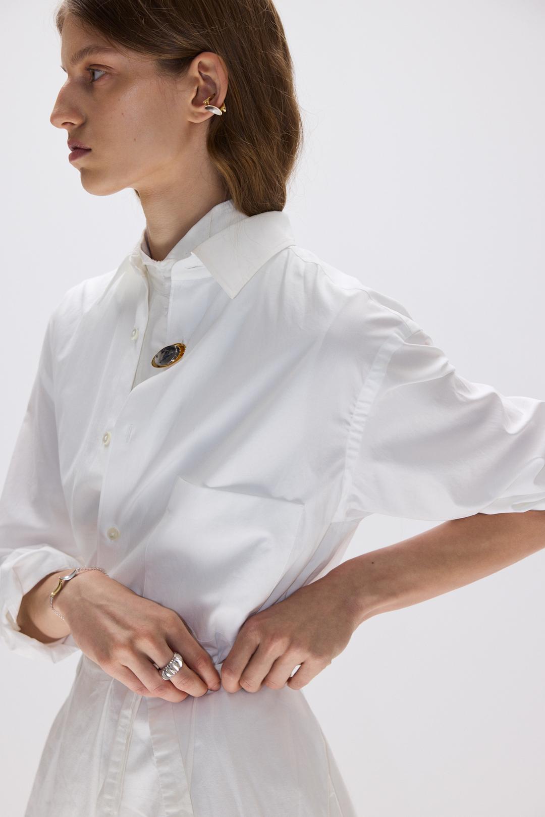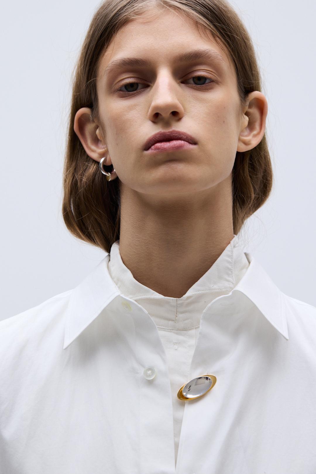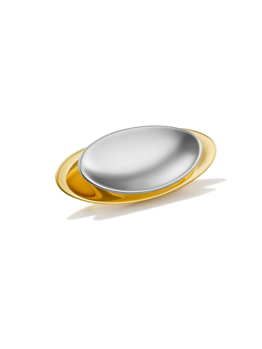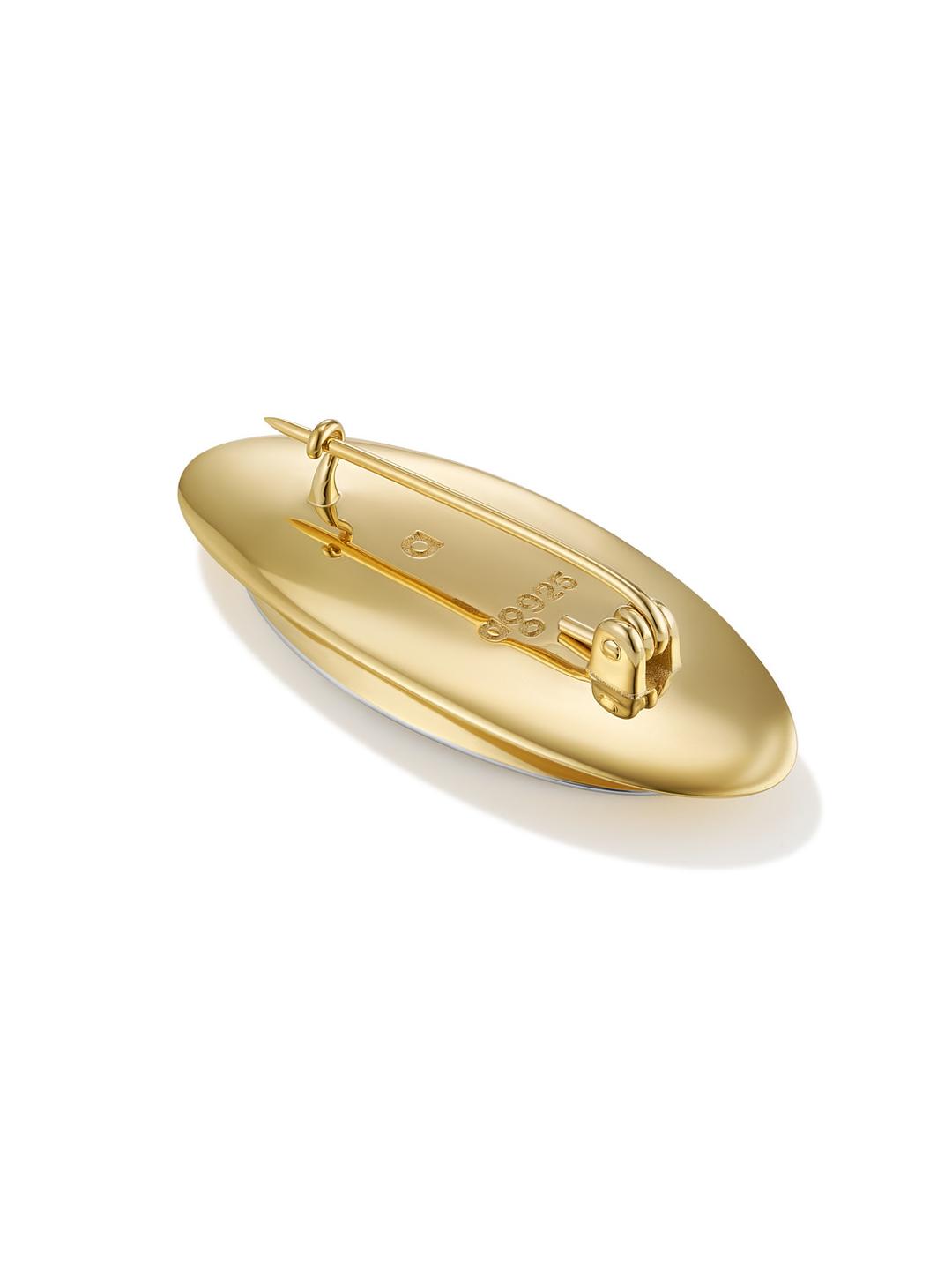 Брошь с комбинированным покрытием золотом и родием — размышление о притяжении. Вогнутая поверхность собирает и отражает лучи, создавая красивый блик.