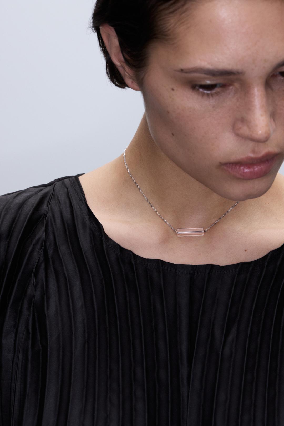 Хрустальный стеклярус для этого украшения огранен вручную. Для этого украшения используем природное сырье с включениями, которые делают каждый камень уникальным. Прозрачный стеклярус, главный символ коллекции, здесь превратился в почти невесомое и деликатное украшение.