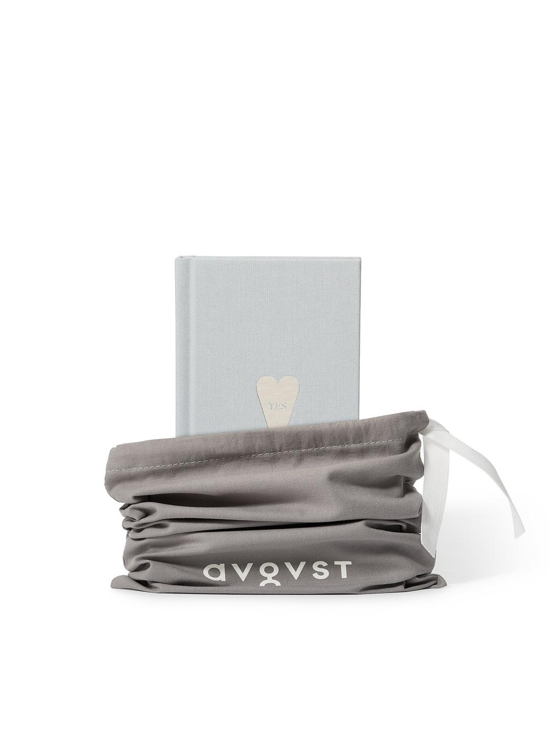Блокнот упакован в хлопковый пыльник на завязках с логотипом Август.