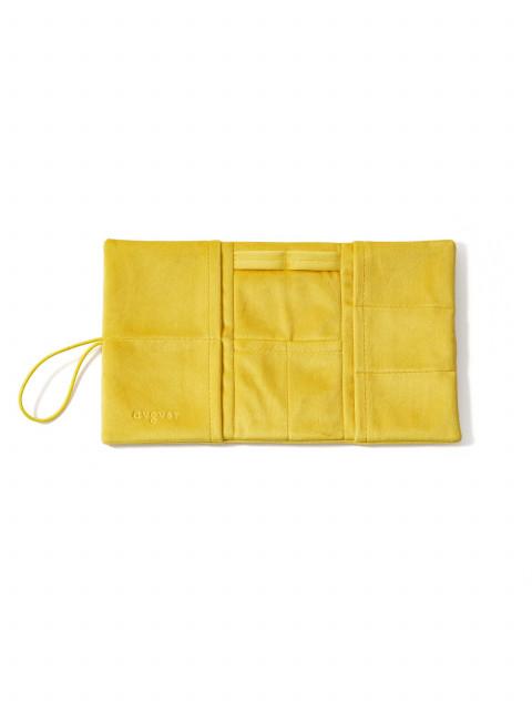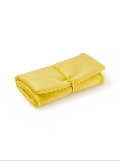 Выполнен из желтого велюра с мягкой поролоновой прослойкой. Два больших, три средних и два узких отделения, чтобы украшения не царапались друг о друга; пару серег можно закрепить на специальных петельках. Чехол закрывается на резинку. На внутреннюю сторону тиснением нанесен логотип Avgvst.
