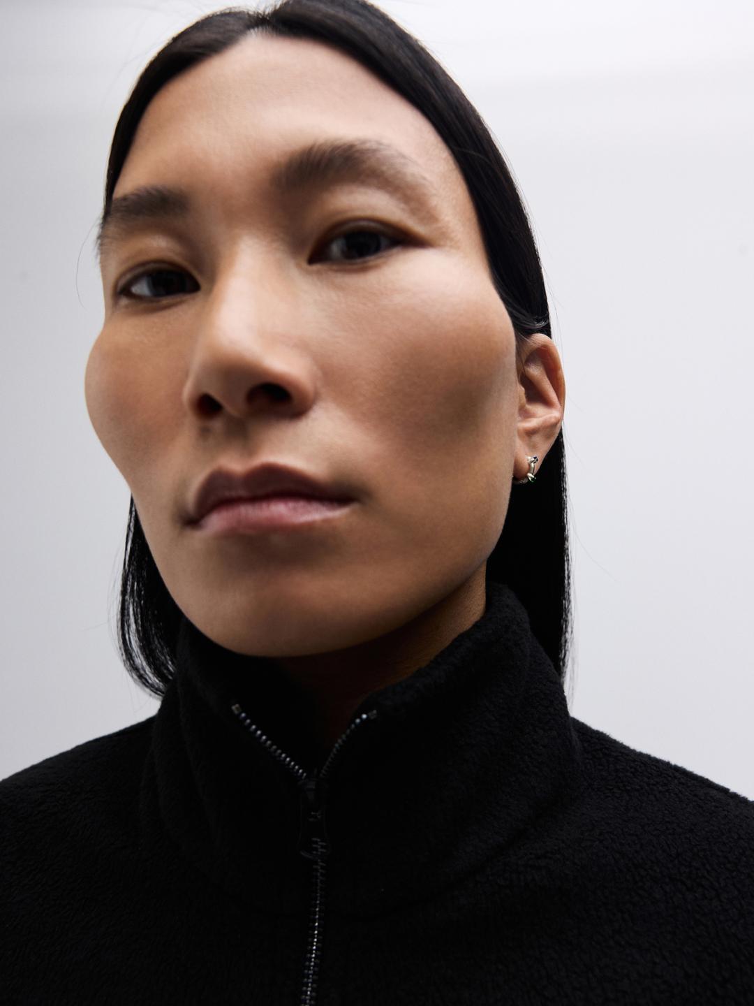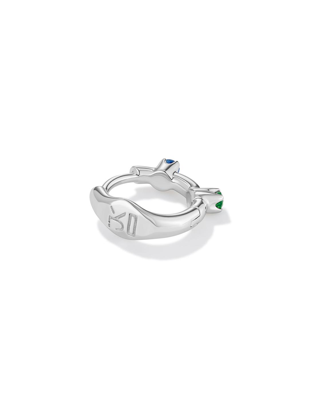 Эту серьгу-кликер можно носить в основном проколе или в дополнительных (в мочке или хряще). Форма крошечных лапок-крапанов отсылает к фирменным лепесткам J.Kim.