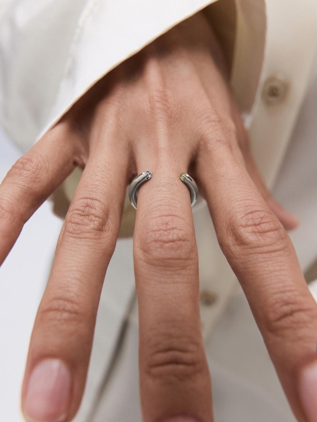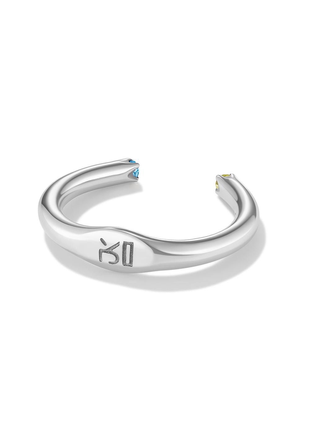 Это кольцо с голубым топазом и нежно-зелёным перидотом (хризолитом) будто обнимает палец. Концы слегка приподняты для комфортной посадки, а форма крошечных лапок-крапанов отсылает к фирменным лепесткам J.Kim.