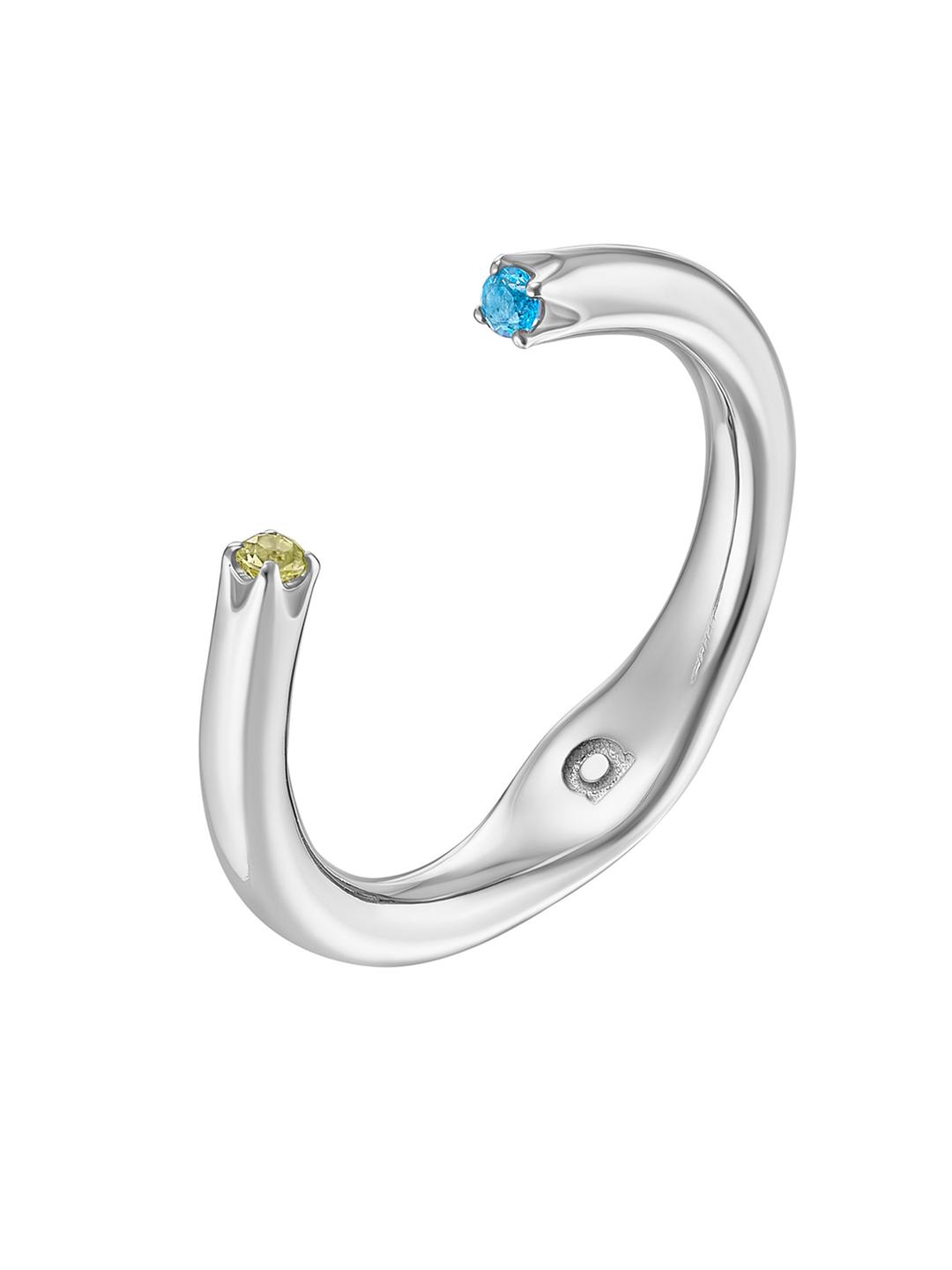 Украшение из коллаборации Avgvst x J.Kim, посвящённой гостеприимству. Это кольцо с голубым топазом и нежно-зелёным перидотом (хризолитом) будто обнимает палец. Концы слегка приподняты для комфортной посадки, а форма крошечных лапок-крапанов отсылает к фирменным лепесткам J.Kim.