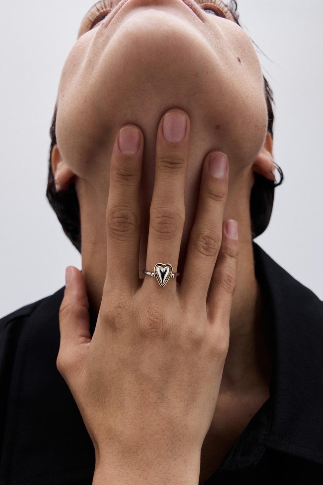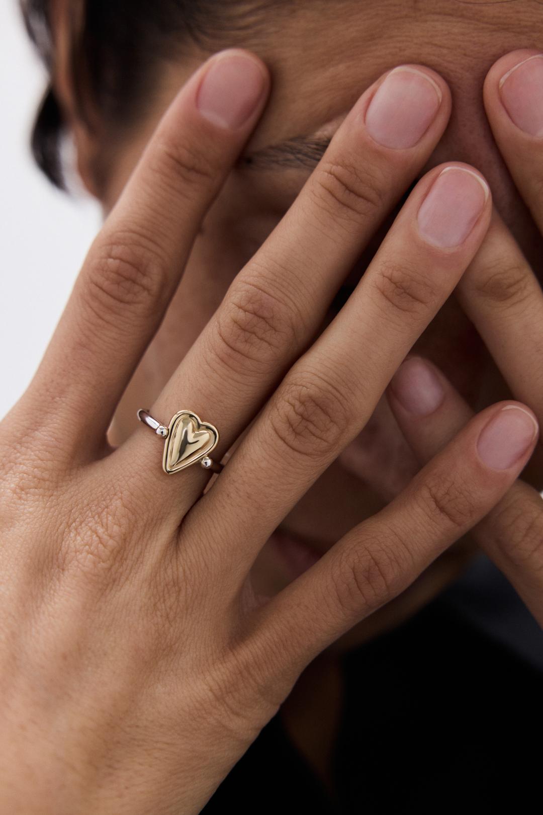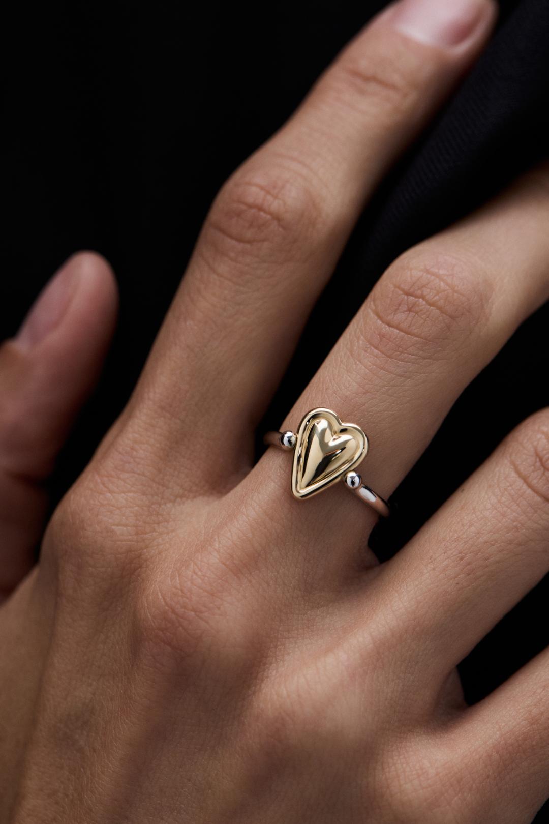 Чтобы в одном украшении соединились два цвета металла, оно собирается вручную из нескольких деталей. В этом украшении шинка (основа кольца) из белого золота, бампер из лимонного золота, а у сердца одна сторона белая, другая лимонная.