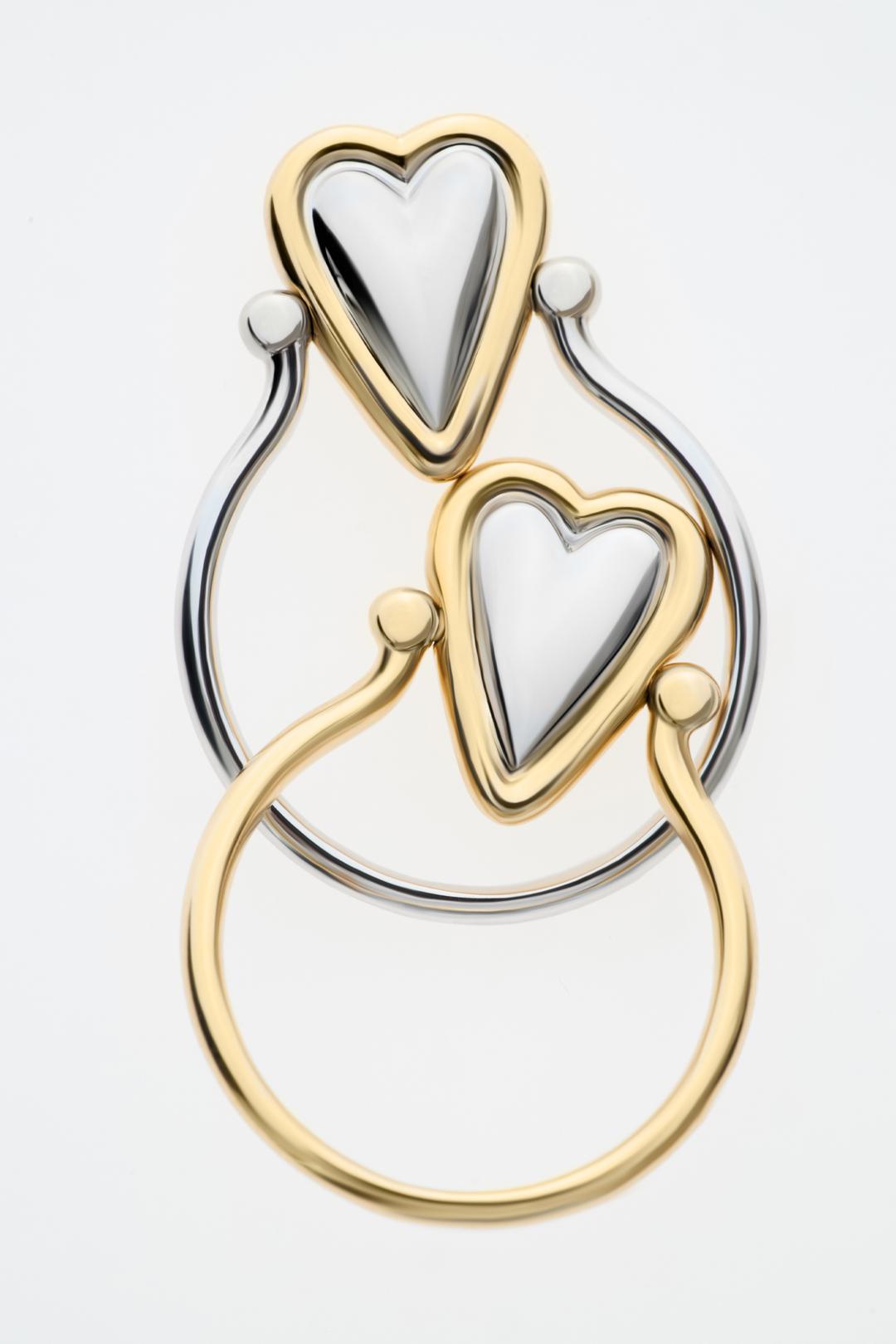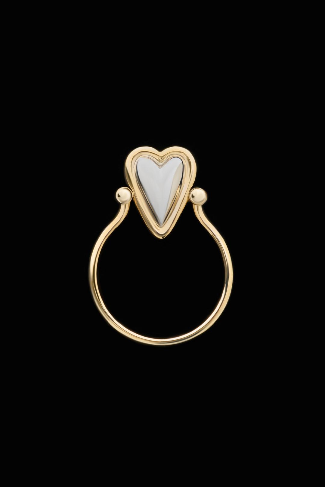 Чтобы в одном украшении соединились два цвета металла, оно собирается вручную из нескольких деталей. В этом украшении бампер и шинка (основа кольца) из лимонного золота, а у сердца одна сторона белая, другая лимонная.