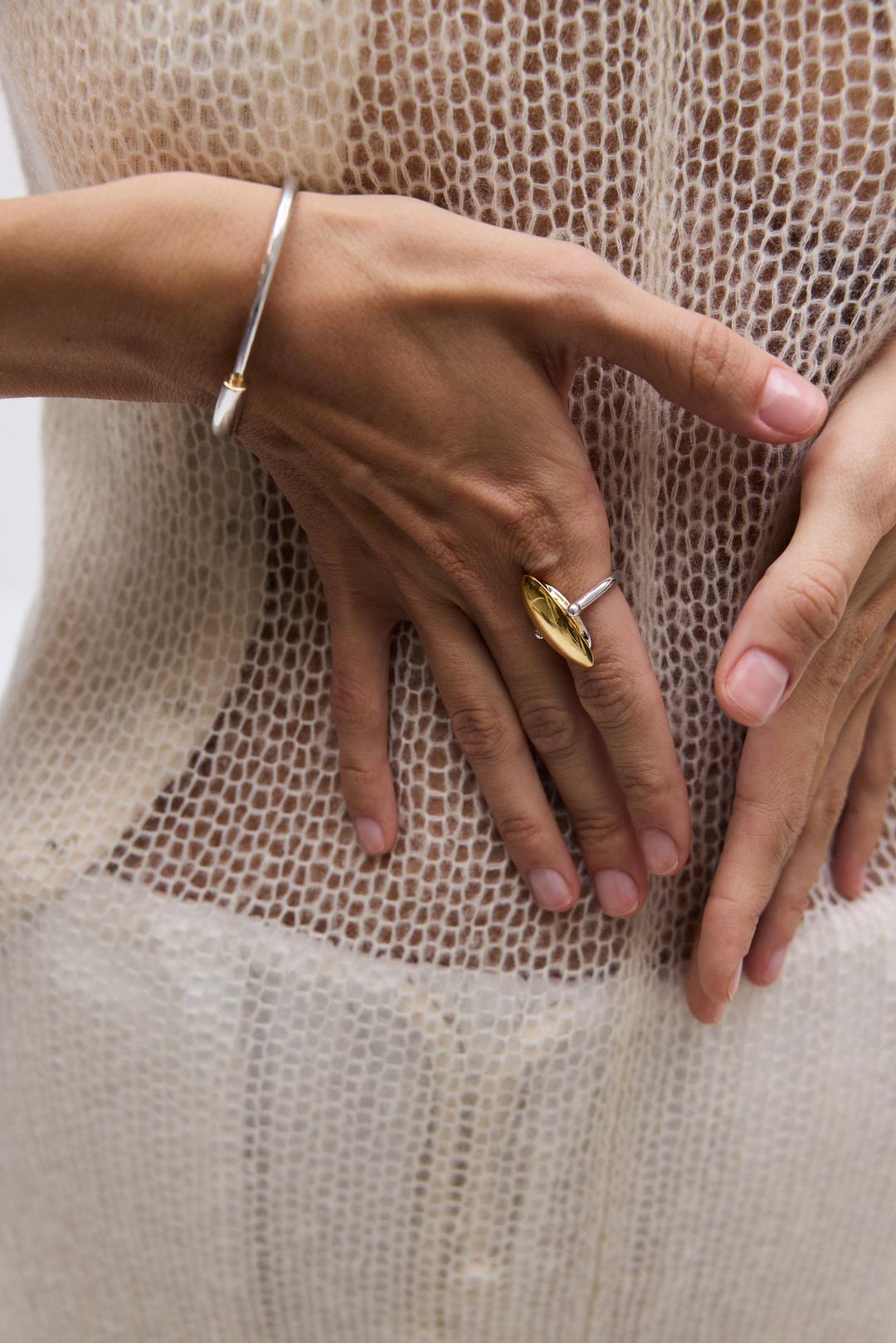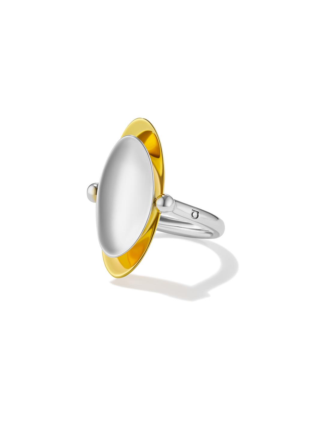 В коллекции Eclipse мы исследовали притяжение абстрактных форм — так появилось кольцо-перевертыш из двух эллипсов с комбинированным покрытием золотом и родием. Двойная вогнутая поверхность и минималистичная выпуклая сторона обладают разным характером, по-разному отражая луч света.