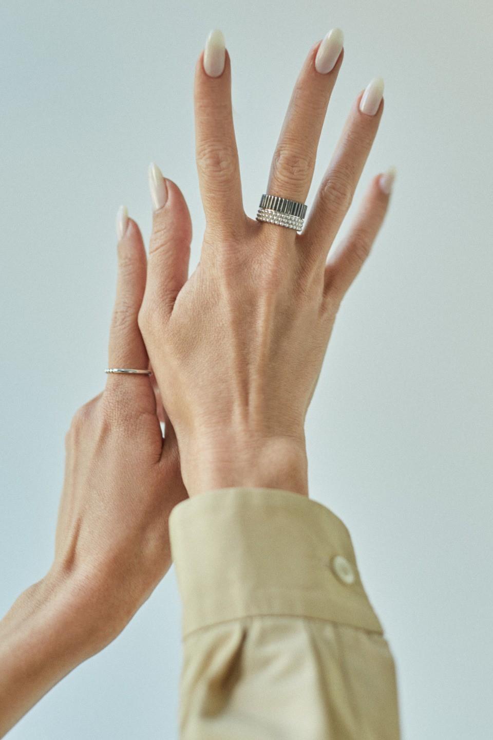 Кольцо из бисера и стекляруса. Ряд бисера покрыт белым родием, а стекляруса — черным родием.