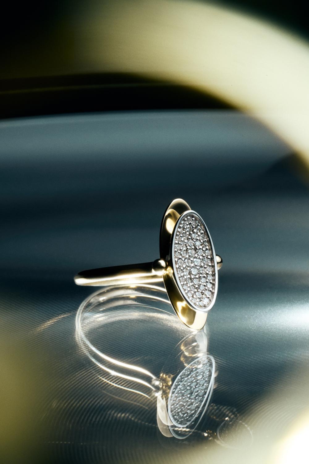 Кольцо-перевертыш из двух эллипсов, будто притягивающихся друг к другу. Вогнутая поверхность покрыта россыпью бриллиантов, а обратная сторона гладко отполирована: стороны по-разному отражают свет.
