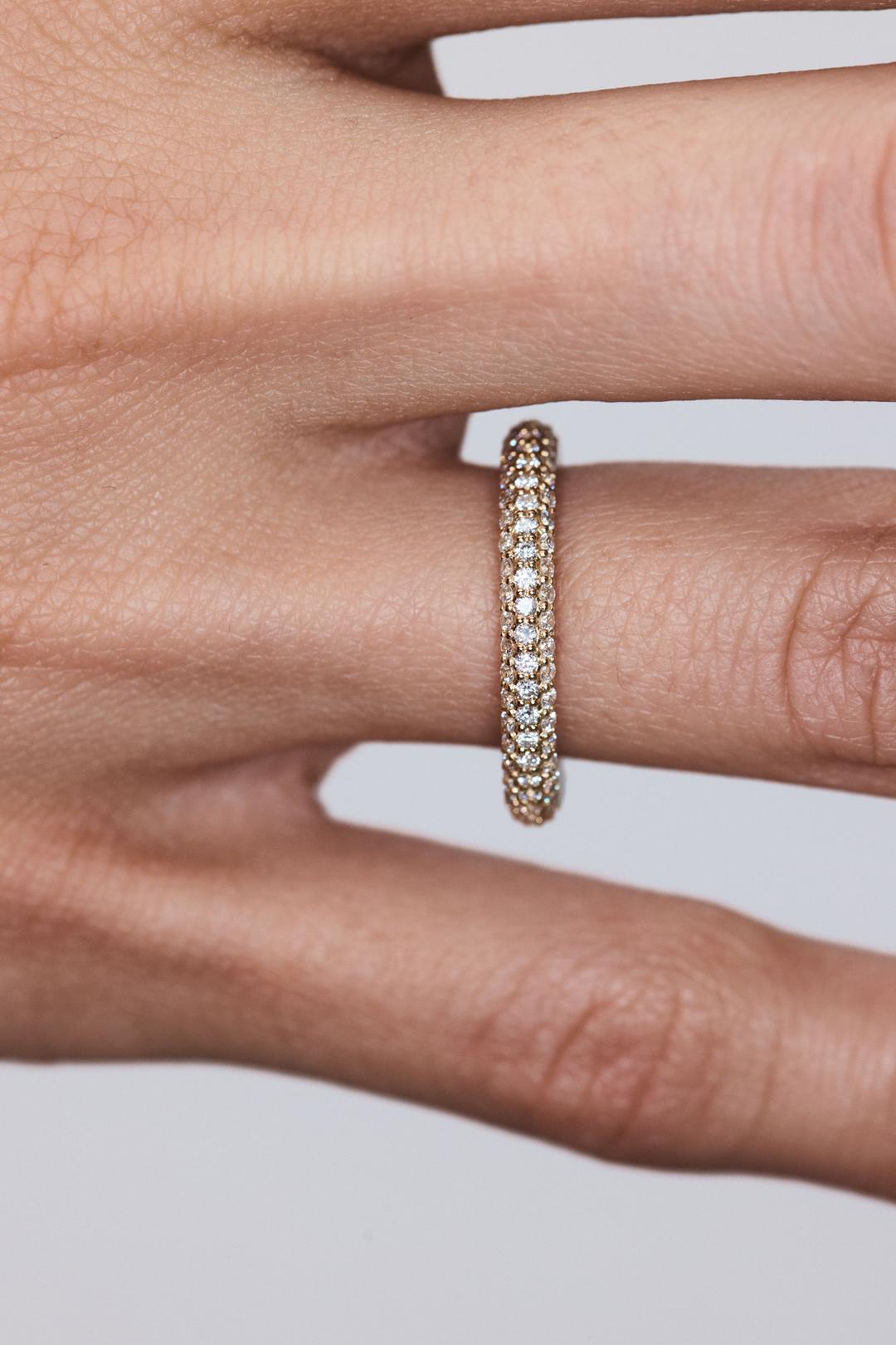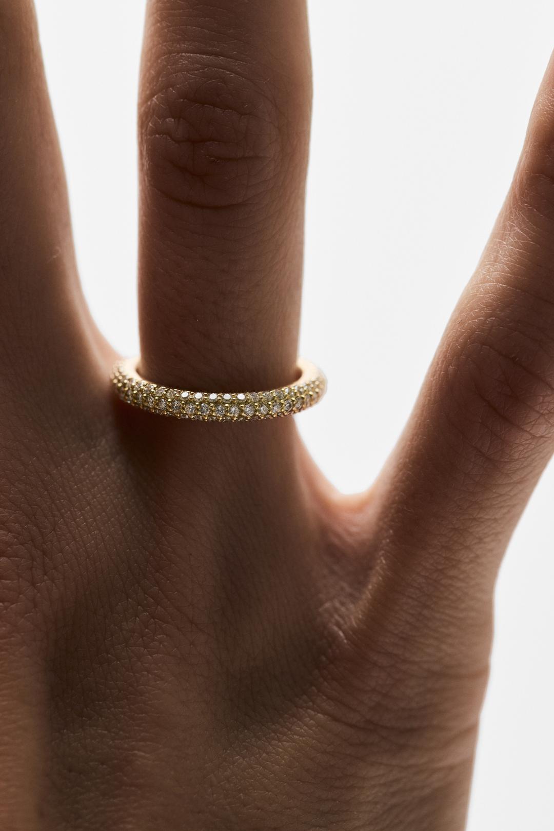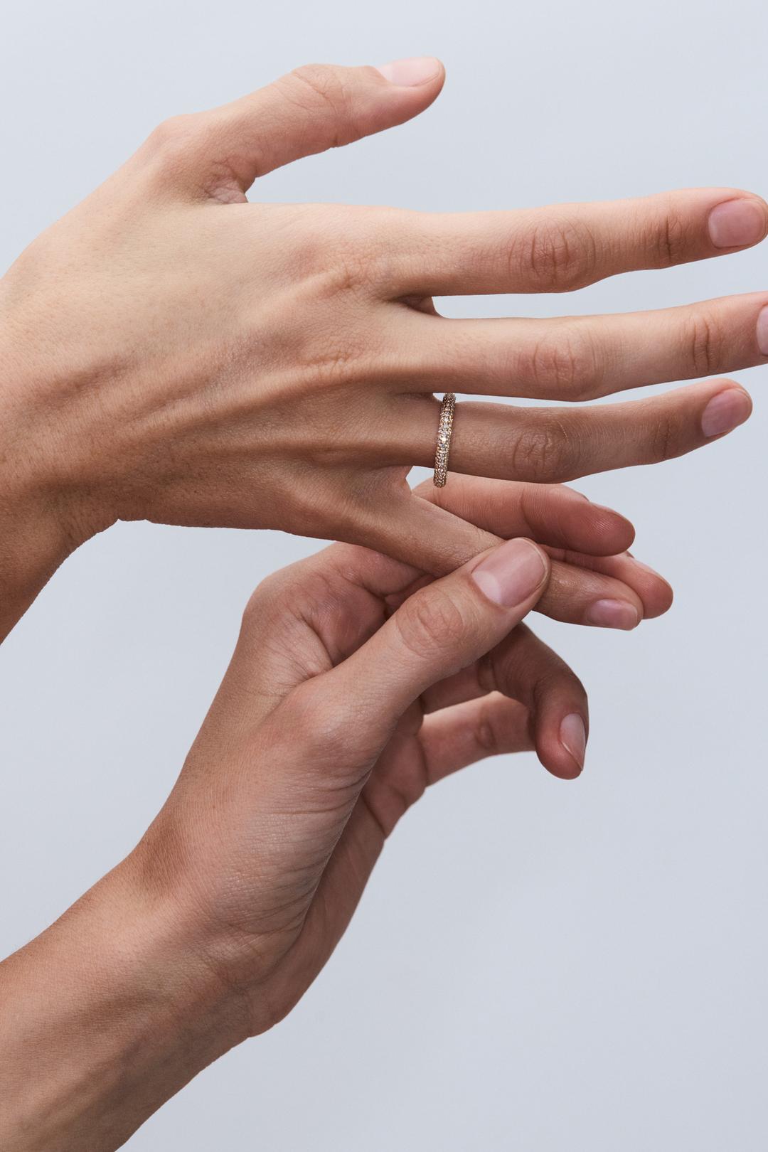 У нас уже есть То самое золотое кольцо для свадьбы — не слишком простое и не слишком сложное, не толстое, но и не тонкое, которое подходит всем. Перед вами его нарядная версия — в облаке бриллиантовой «обсыпки».